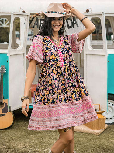 Printed V-Neck Short Sleeve Dress